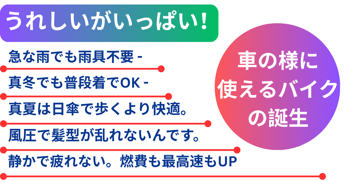 おかげさまで大人気。ご予約殺到中です。あなたのバイクが全天候のスーパーバイクに変身。