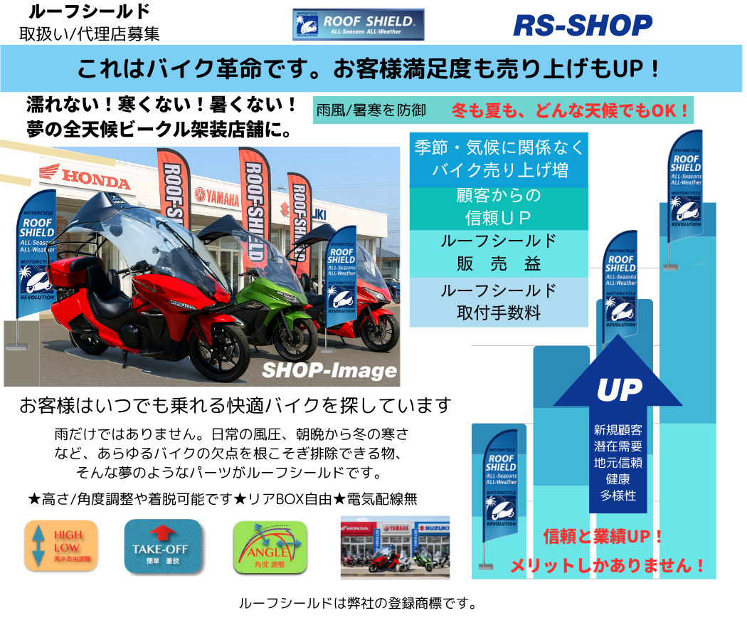 代理店募集ページ ★積極的に販売代理店としてご活躍されたいオーナー様 ★取付代行工賃のみの収益でのご協力いただけるバイク店様 いずれも契約金等のご負担はございません。下記フォームをご記入いただければ販売益/工数/工賃目安等の詳細および募集要項をご返信いたします。 申し込みはこちらから ⇒